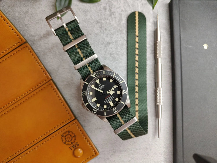 Premium Seatbelt Green and Khaki Pinstripe Watch Strap